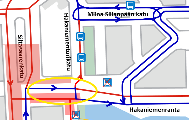 Hakaniemessä tehdään ajoratamaalauksia ja pieniä liikennejärjestelymuutoksia viikoilla 39-40 (24.9.-3.10.)
