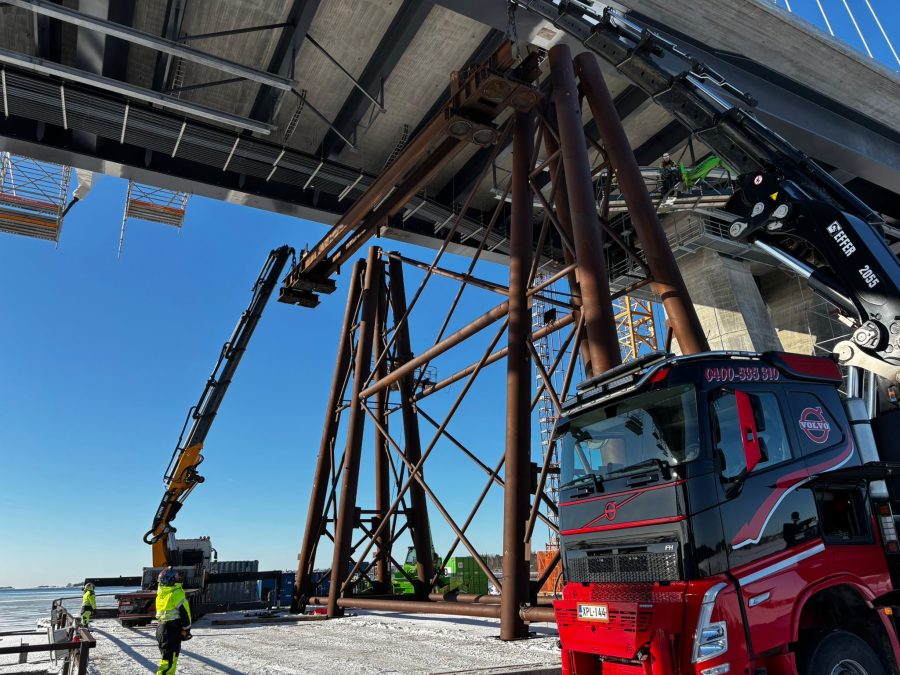 Ennen vinoköysien asennusta sillan kannen paino on levännyt väliaikaisten tukien päällä. Näitä 15-18 m korkuisia väliaikaisia tukia on ollut yhteensä kymmenen.