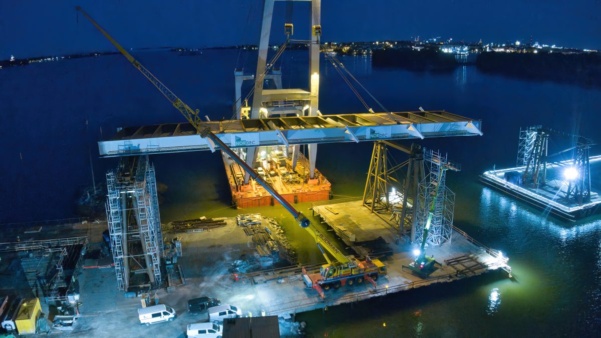 Kruunuvuorensillan kansi lepää 520 m matkalla vinoköysien varassa. Tämän osuuden teräslohkot asennettiin paikoilleen merinosturilla heinäkuussa 2023.